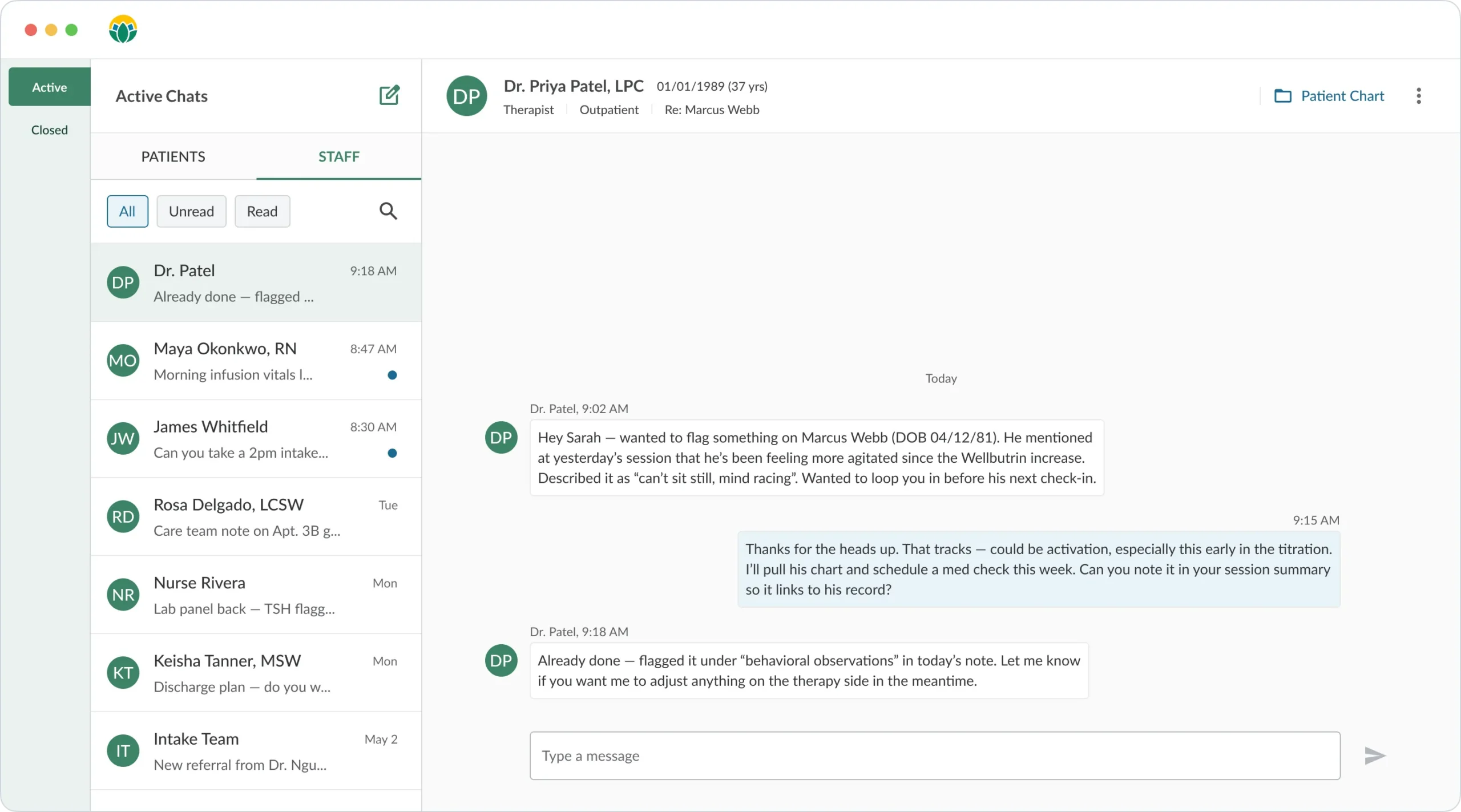 Secure internal messaging in ProsperityEHR keeps every conversation attached to the patient's record. A nurse can update the team on morning infusion vitals. A therapist can flag a concern about medication side effects directly to the prescribing psychiatrist. Those exchanges become part of the permanent record of care — supporting both clinical quality and compliance.