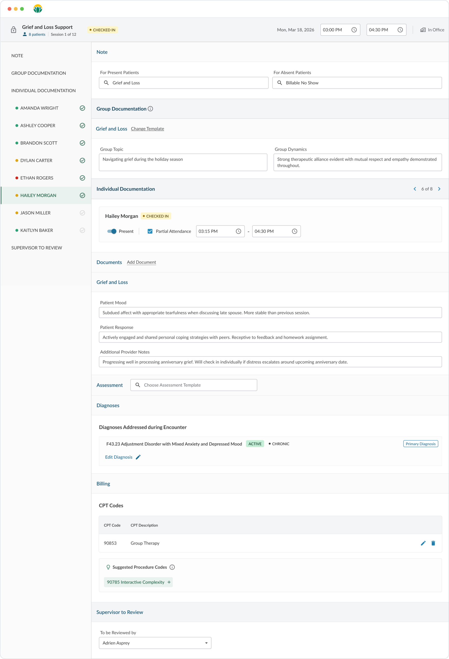 Manage rosters, take attendance, and complete notes in one workflow. Session data flows directly into each patient’s record and billing totals.